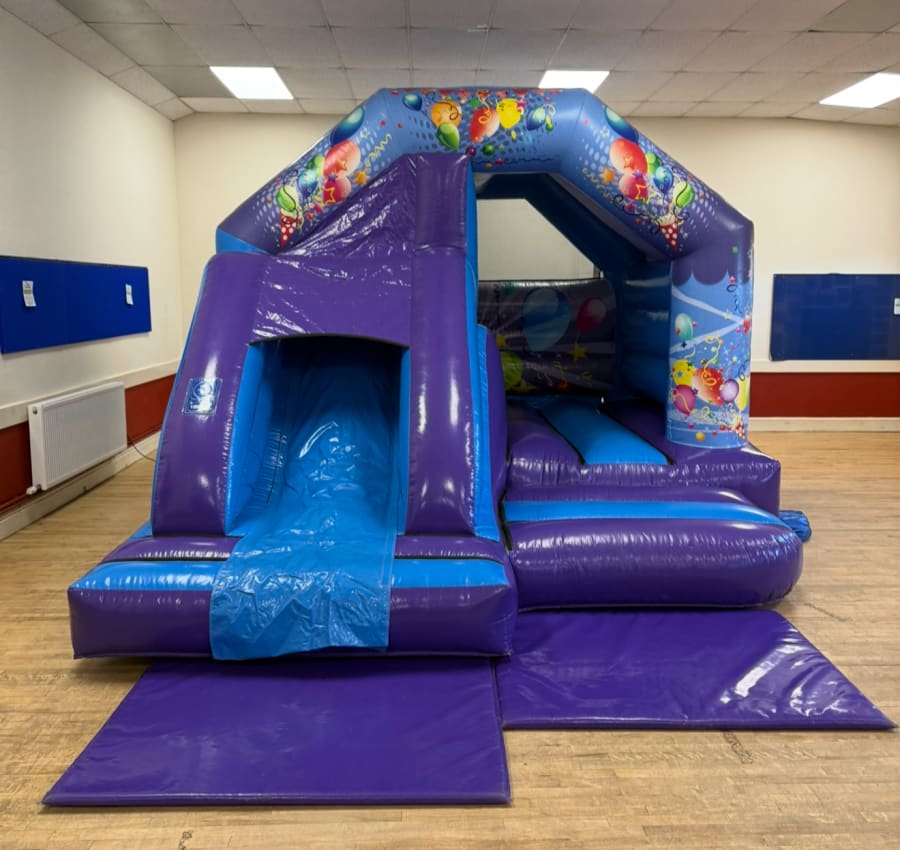 Make every event an unforgettable experience with our vibrant Party Combi Castle. Combining the excitement of a bouncy castle with the added thrill of a slide, this party-themed inflatable is designed to deliver hours of fun for children aged 12 years and under. With its striking purple and blue colours and cheerful balloon artwork, it's the perfect addition for birthday parties, family gatherings, school fetes, and community events.